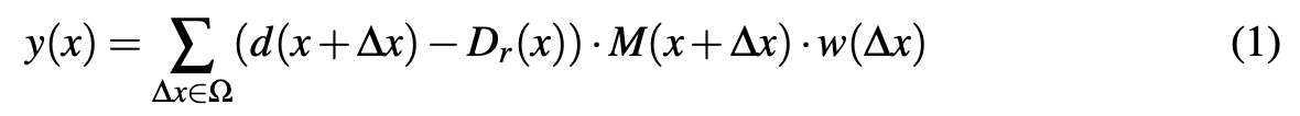 ∆x ∈ Z^2 은 offsets을 의미하고, Ω ⊂ Z^2 은 offset의 집합, 그리고 w(∆x) : Z^2 → R^n 은 kernel의 learnable weight를 의미한다. M(x)는 binary mask로 M(x) = 0 if d(x) = 0, and M(x) = 1 if d(x) > 0이다. Dr(x)는 reference depth로 각 sliding window에서 reference로 avarage depth map을 나타내며 아래와 같이 나타낼 수 있다.