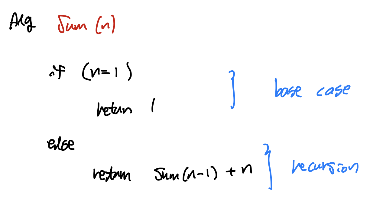 - ๋ฒ ์ด์ค ์ผ์ด์ค : ์ฌ๊ทํจ์์์ ํญ์ ๊ฐ์ ธ์ผ ํ๋ ๋ถ๋ถ์ผ๋ก ์ด ๋ถ๋ถ์ ์ฌ๊ท ์์ด ์ง์ ํด๊ฒฐ
