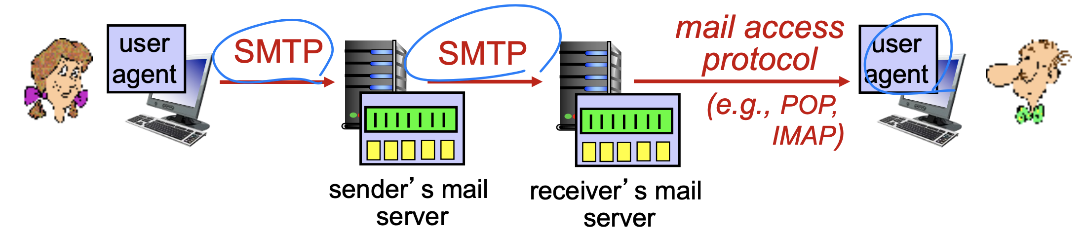 - SMTP protocol : server(mail 받는 server)와 client(mail 보내는 server)사이에 message 전달