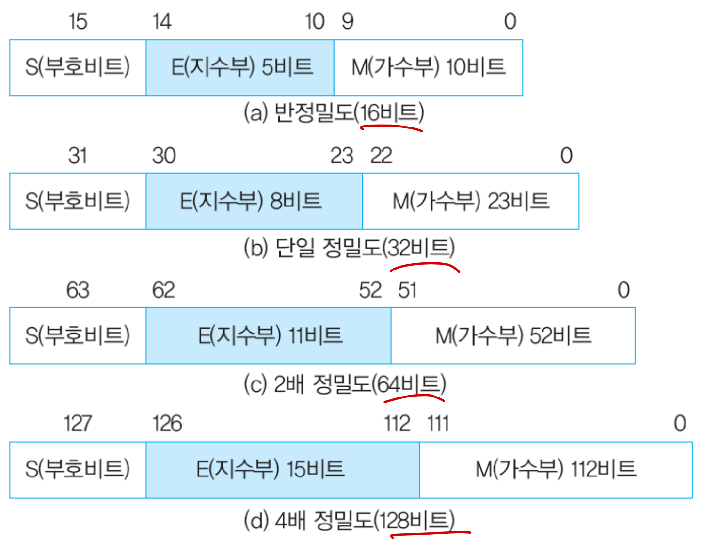 - ๋ถ๋์์์ (floating point) : ์์์ ์์น ์ด๋์์ผ ์ง์๋ก ๋ํ๋. ๋์ ๋ฒ์ ์ ๋ํ๋ผ ์ ์์ง๋ง ์ฐ์ฐ์๋ ๋๋ ค ๋ณ๋์ ๋ณด์กฐํ๋ก์ธ์ ์ฌ์ฉ